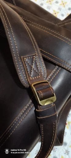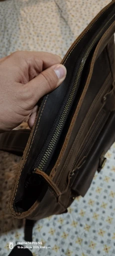 quality leather. very spacious. Textile interior with laptop space and small interior pocket with zipper. adjustable leather straps. metal zipper and bags on the sides with magnetic clasp. It's great. understand it's worth it